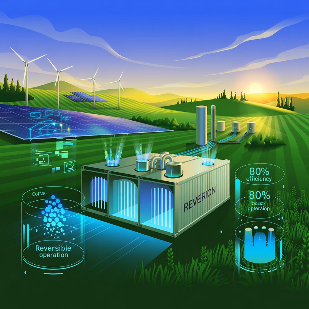 Reverion developed something wild: a reversible power plant that can switch between generating electricity and storing energy in under 60 seconds. Their solid oxide fuel cells achieve 80% electrical efficiency. When there's surplus renewable energy in the grid, their system automatically flips to electrolysis mode and produces green hydrogen or synthetic methane.